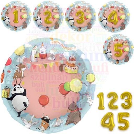 Vidám állat mintás lufi – ez a fő léggömb, mérete 56 cm, héliummal fújva szállítjuk! Erre lehet ragasztani a tetszőleges aranyszínű számos lufit.
