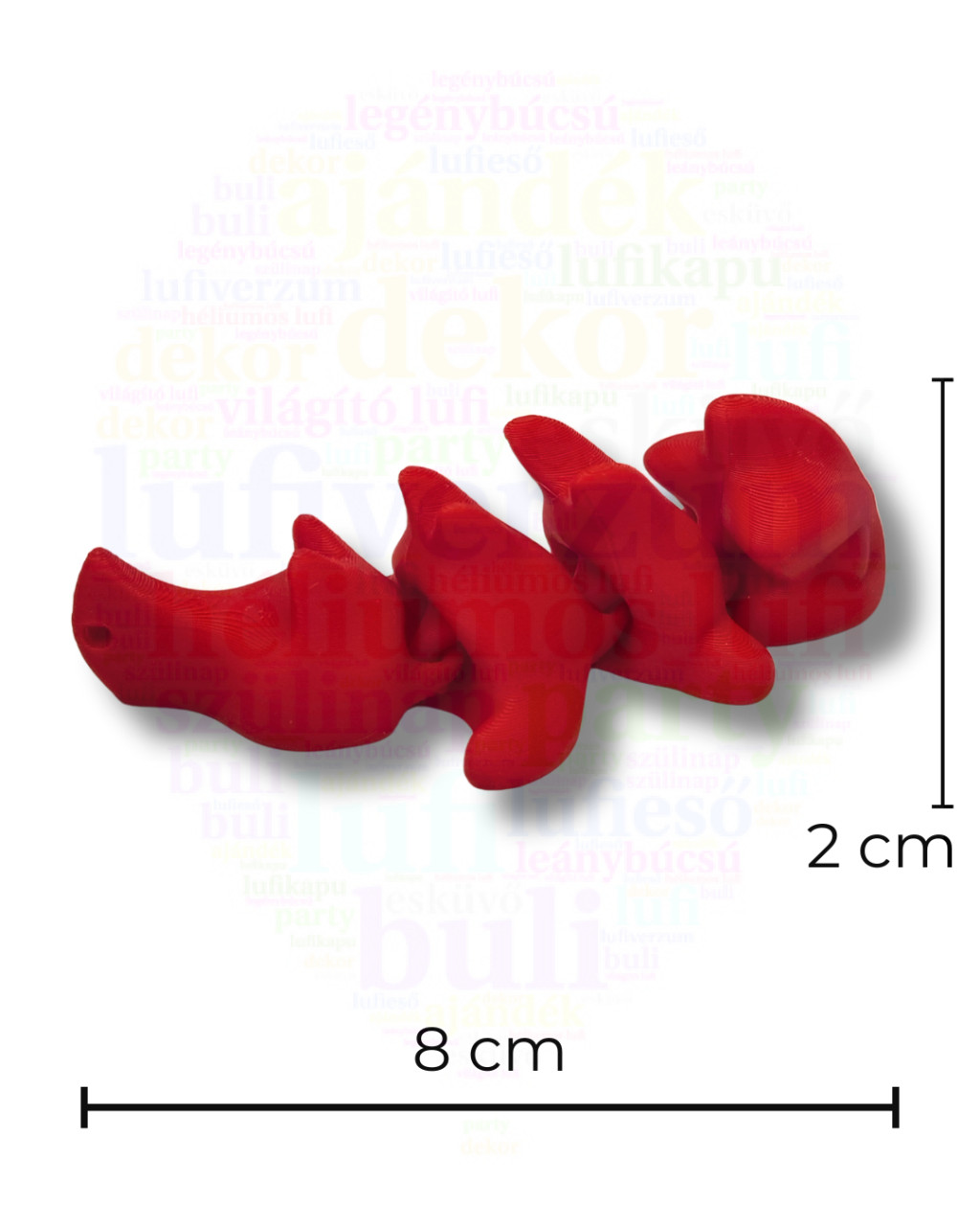 Ez a 3D nyomtatott fekvő sárkány figura nem csak látványos, hanem igazán interaktív darab: a gerince mozgatható, így finoman hajlítható, a teste természetesen követi a mozgást. A fekvő póz és a részletes forma egyszerre teszi dekoratívvá és játékossá.