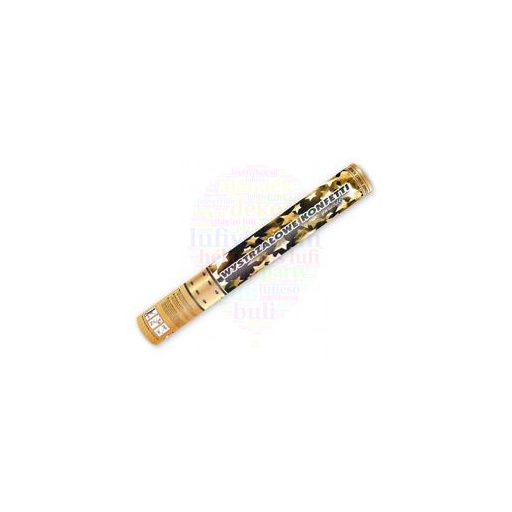 Sűrített levegővel működő konfetti ágyú. A hengert a nyíl irányában elforgatva csillag alakú konfettiket lövell ki. Töltet: aranyszínű csillag alakú konfettik. Beltéri használatra javasolt. A konfetti esőt kb. 1 percig élvezheted.