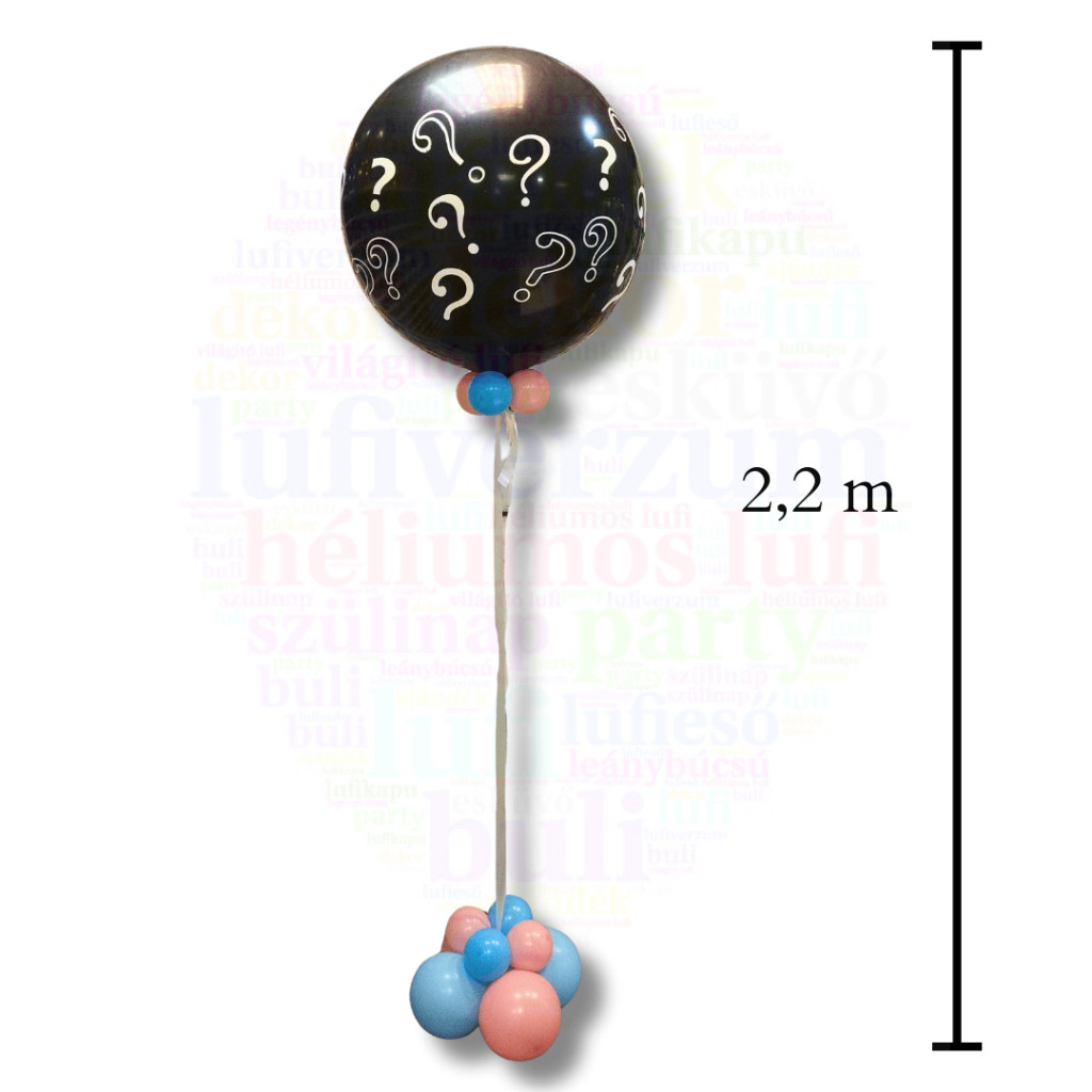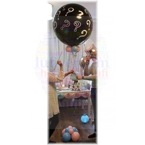 Fogjuk ezt a hatalmas gumi lufit, amit felfújunk 80 cm átmérőre ( csak hogy ki-be férjél az ajtón!) és megtöltjük kék vagy pink lufikkal és konfettivel, rákötjük egy cuki készített súlyra és már visszük is vagy elviheted tőlünk!
