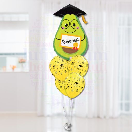 Ez a különleges ballagási luficsokor a humorra és a látványra épít. A 4 db sárga smile latex lufi stabil alapot ad, amit egy 64 cm-es Bravocadó (avokádó karakteres) fólia lufi tesz igazán egyedivé.