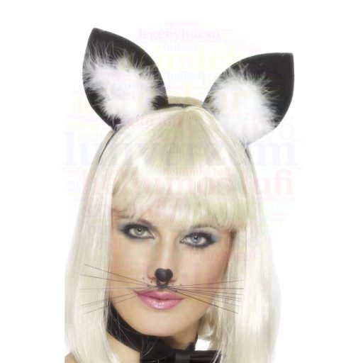 Fekete, filces anyagú cicafülek, fehér szőrmés rátét díszítéssel, hajráfra rögzítve.