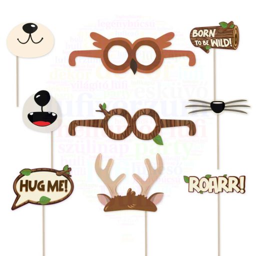 A készlet tartalma: 9 db kellék (3 felirat, 3 db állatorr, 2 db pohár, szarv), 9 db fapálcika és 20 db ragasztópötty és 3 db ragasztószalag a kellékek rögzítéséhez.