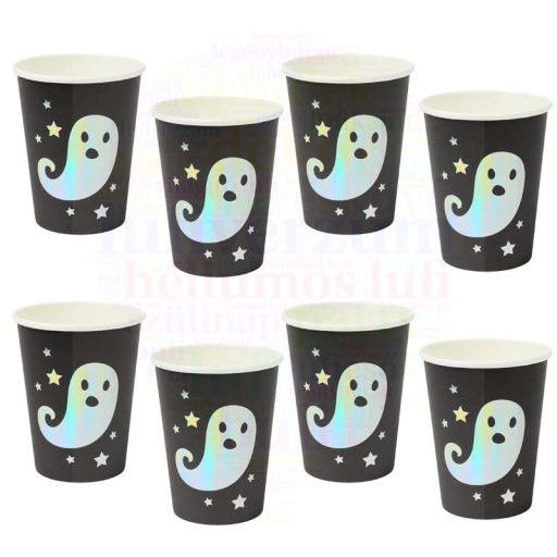 A poharak fekete alapon ezüst szellem mintával díszítettek, melyek izgalmas és egyedi megjelenést kölcsönöznek a parti hangulatnak. Az elegáns design mellett a papír anyag könnyű és környezetbarát alternatívát jelent a hagyományos műanyag poharakhoz képest.