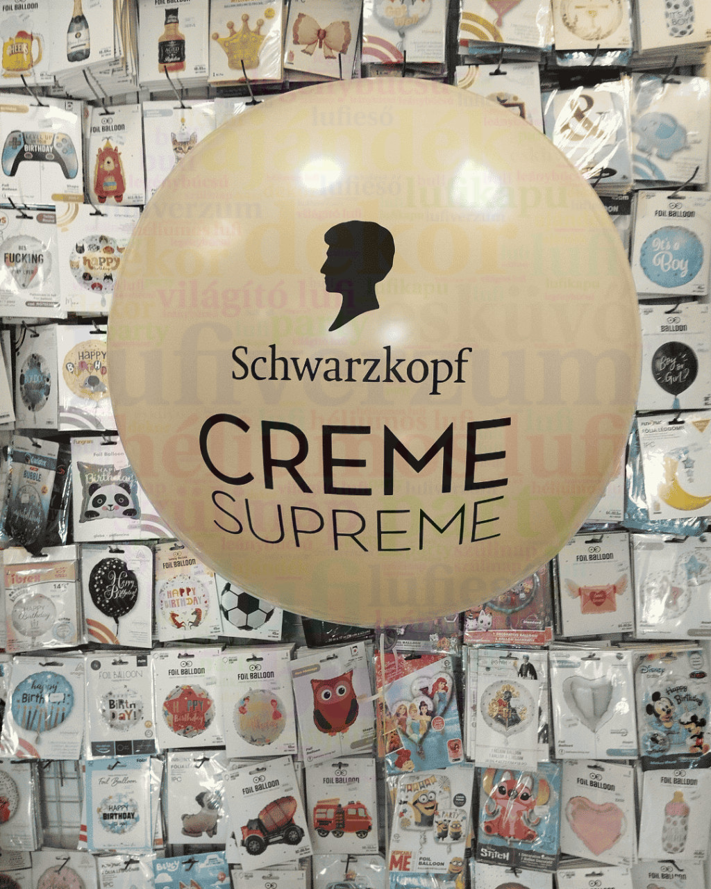 Az ár magában foglalja a lufit, a hélium töltést, a szalagra kötést és a matricázást.