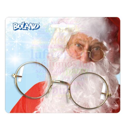 Mikulás jelmez kiegészítő kellék. Ezüst színű, kerek, lencse nélküli szemüveg. Anyaga: műanyag.