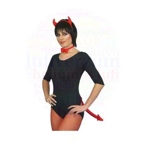 Piros színű, lurex anyagú szarvak, hajráfon. Piros, bársony csokornyakkendő. Piros, bársony farok.