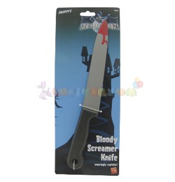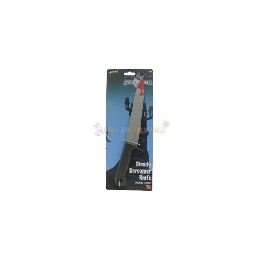 Elengedhetetlen rémisztő kiegészítő kellék, farsangi, vagy halloween partira. Fekete nyelű kés, szürke színű pengével, hegyén piros vért imitáló festés. Mérete: 4 cm x 35 cm. Anyaga: műanyag.