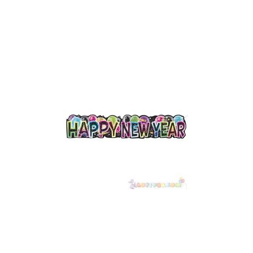 Színes, kartonból kivágott Happy New Year felirat, szilveszteri motívumokkal díszítve.
